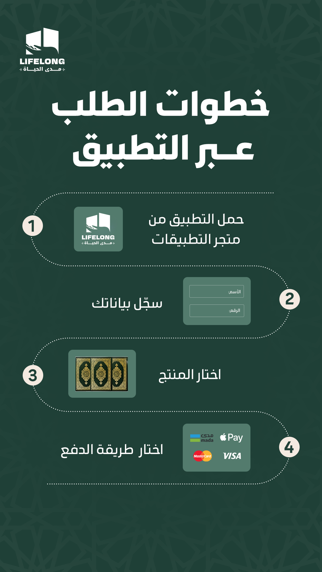 تطبيق مدى الحياة منصة إلكترونية متخصص في توصيل الكتب و توزيع المصاحف، بخدمة احترافية وسريعة تصل إلى جميع أنحاء العالم، وبخبرة عريقة في مجال التوصيل والتوثيق